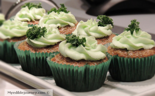 Spiced gluten free carrot-kale muffins with goat cheese frosting – Find the link to the Namaste Spice Cake Mix on the Gluten Free Guide to Niagara – http://glutenfreeguidetoniagara.wordpress.com/2013/01/28/kale-a-palooza/