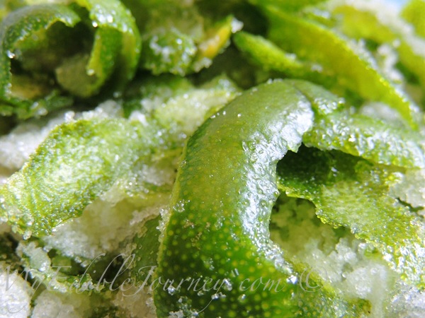 Peel the zest from the limes, avoiding as much of the bitter white pith just below as possible. Toss it gently with the sugar and salt in a bowl or jug large enough to hold the water as well (yeah, oops, didn’t do that). Leave it alone (I mean it) for an hour.