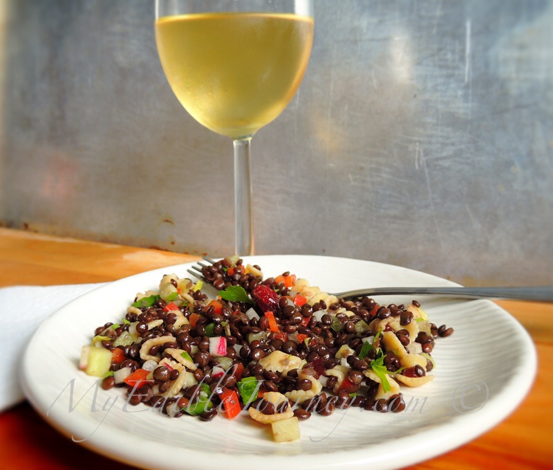 Black lentils are also known as Beluga lentils because when they are cooked, they glisten and look something like Beluga caviar.  They hold their shape well and have a nice texture.  Green lentils can be substituted for them.  As for the pasta in this salad, any small pasta would work, as would other grains.  I used an orecchiette-type pasta, which I learned via some lovely Italian friends on Twitter is called sorprese, or ‘surprise.’  They are adorable, really. The dried fruit and light soy may sound strange, but the fruit contrasts with the earthiness of the lentils, while the soy compliments it quite nicely, without making it taste of Chinese takeout.