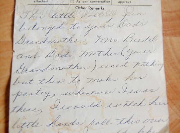 This little rolling pin belonged to your Dad’s Grandmother, Mrs. Beedel and Dad’s Mother (your Grandmother) used nothing but this to make her pastry. Whenever I was there, I would watch her little hands roll this over her pastry. I would like ***** to have this, if she cares to. I have always treasured it.