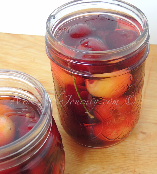 For each jar, I used nearly equal amounts (by weight) of pitted cherries and vodka (probably about 6-7 ounces of vodka went into 8 ounces of cherries). Bourbon, rum, whisky or another spirit can be used (watch the sweetness if you’re using a sweetened liqueur. In the larger jar pictured, for each 6 ounces or so of booze, I used 1 tablespoon of sugar and brought it up to almost a boil over medium heat. Do be careful. It can flame up on it’s own so easily. I then poured this over the cherries in a mason jar.
