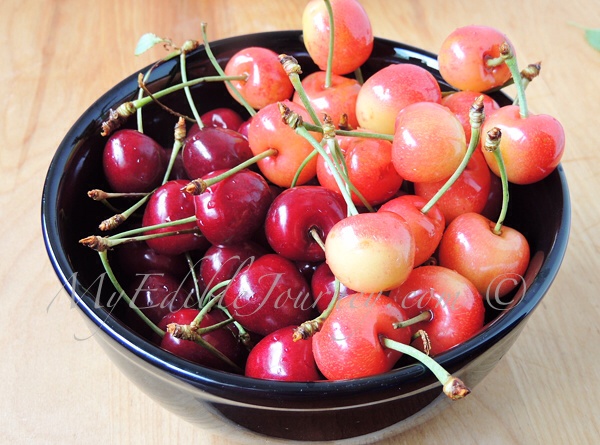 I used a mixture of the typical dark red sweet cherries which are so abundant, and some Queen Anne cherries, which (right now anyway) are firmer and a bit less acidic. I don’t have a recipe so much as a method.