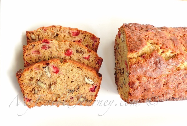 I love cranberries. Not just for their tangy flavour and amazing gelling ability, but also for the fact that they freeze so perfectly. They also play well with other, sweeter tastes, like bananas. This loaf is a marvel of taste and texture. And a great way to make the most of all the fresh cranberries that are in the stores now. ~ Cranberry Banana Nut Bread